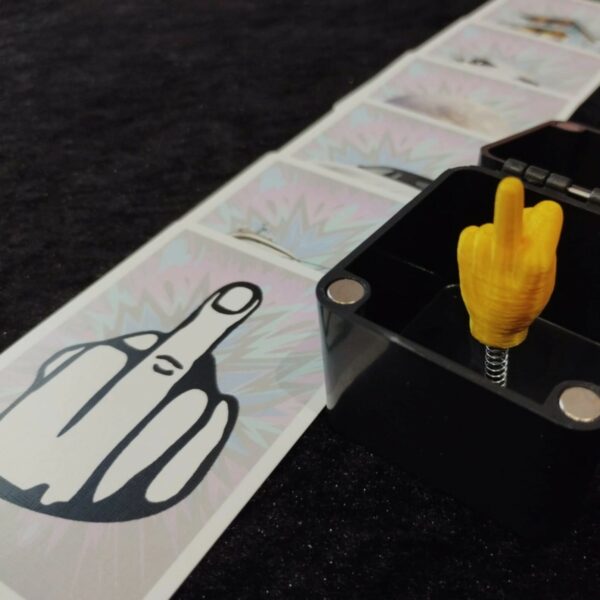 FUCK est composé de 6 cartes au format poker et d’un petite boite contenant un Fuck monté sur ressort.