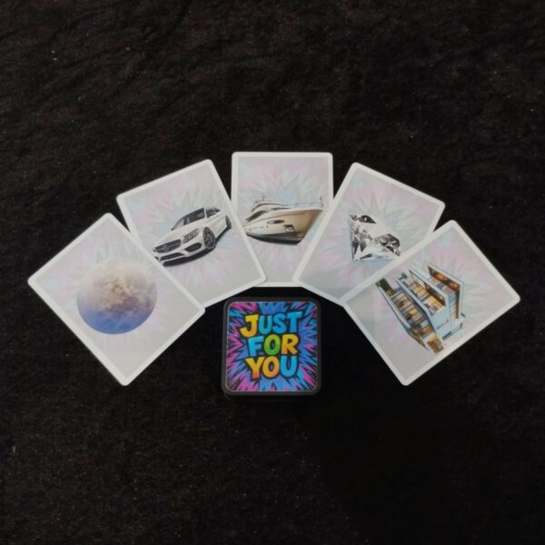 Déposez devant votre participant une petite boite qui servira de révélation à la fin de la routine et montrez lui ce que vous pourriez lui offrir pour tenter de le ou la séduire : une voiture, un yacht, une villa, un diamant, un fragment de lune ? Puis il sélectionnera l’une de ces cartes selon une procédure que vous lui aurez montré auparavant.